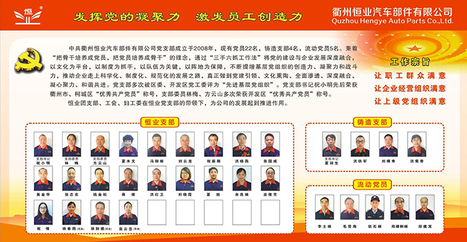 中共衢州17C.COM汽車部件有限公司黨支部成立(lì)於(yú)2008年,現有黨員22名,鑄造支部4名,流動黨員5名(míng)。秉著(zhe)“把骨(gǔ)幹培養成(chéng)黨(dǎng)員,把黨員培養成骨幹”的理念,通過“三手六爪工作法”將黨的建設與企業發(fā)展深度融(róng)合,以文化為平台,以製度為抓手,以隊伍為關鍵,以陣地為保(bǎo)障,不斷提增基層黨(dǎng)組織的創造(zào)力、凝聚力(lì)和戰鬥力,推動企業走上科學(xué)化、製度化、規範化的發展之路,真正做到黨建引領、文化熏陶、全麵滲透、深(shēn)度融合、凝心聚力、和諧共(gòng)進。黨支部多次被區委、開發區黨工委評為“先進基層黨組織(zhī)”。黨支部書記祝小明先後榮獲衢州市(shì)、柯城區“優秀(xiù)共產黨員”稱號,支部委員林梅、方雲山多次榮獲開發區“優秀共產黨員”稱號。